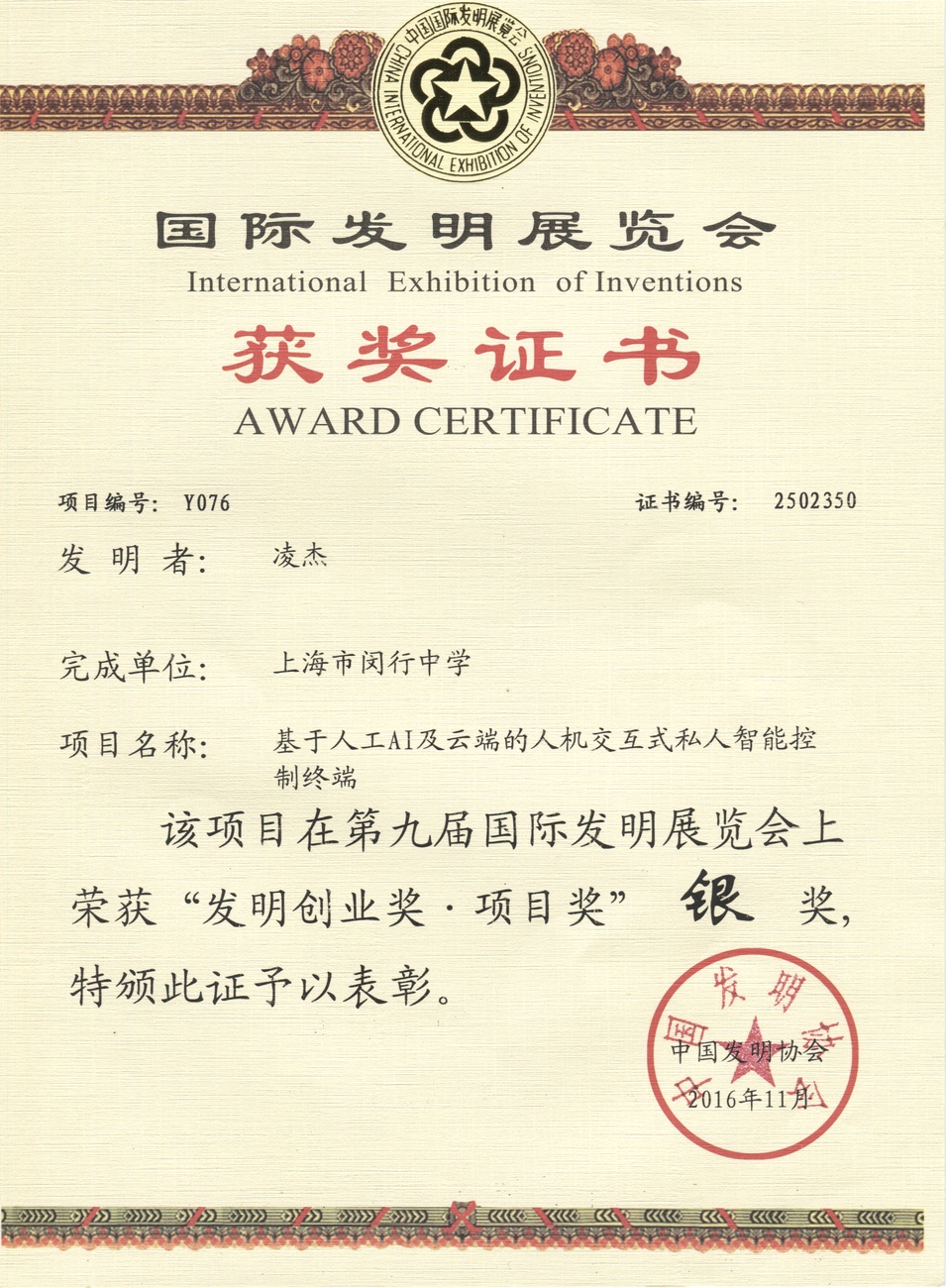| 基于人工AI及云端的人机交互式私人智能控制终端 | 凌杰 | 银奖 | 2016年 |