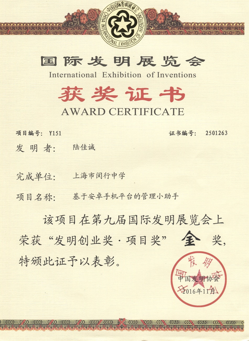 | 基于安卓手机平台的管理小助手 | 陆佳诚 | 金奖 | 2016年 |