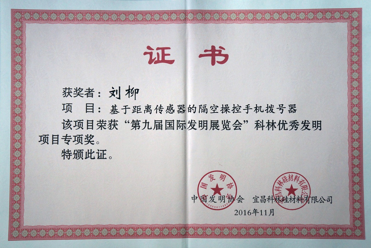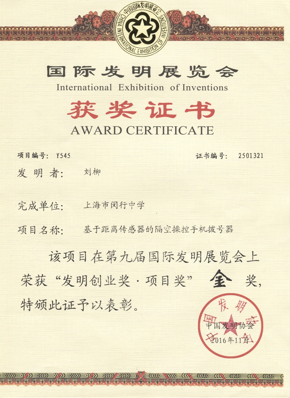 | 基于距离传感器的隔空操控手机拨号器 | 刘柳 | 科林优秀发明项目专项奖 | 2016年 |