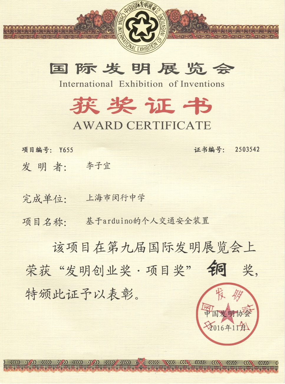 | 基于arduino的个人交通安全装置 | 李子宜 | 铜奖 | 2016年 |