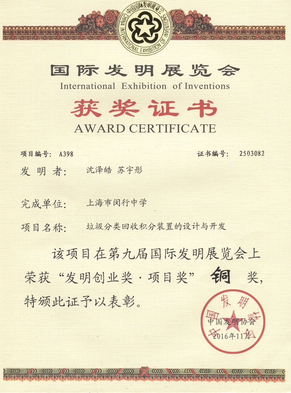 | 垃圾分类回收和分装置的设计与开发 | 沈泽皓, 苏宇彤 | 铜奖 | 2016年 |