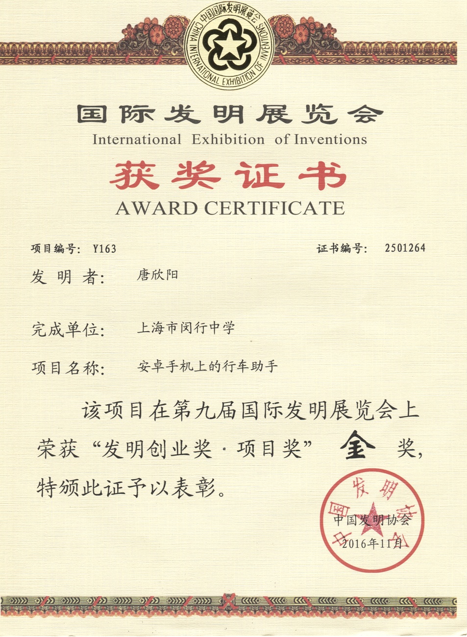 | 安卓手机上的行车助手 | 唐欣阳 | 金奖 | 2016年 |