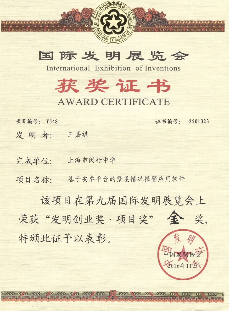 | 基于安卓平台的紧急情况报警应用软件 | 王嘉祺 | 金奖 | 2016年 |