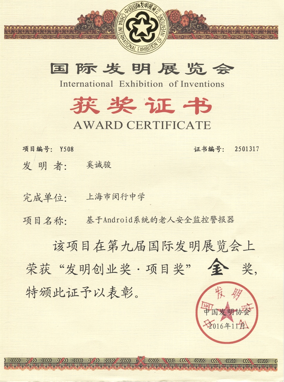 | 获奖项目 | 获奖者 | 奖状(可点击) | 获奖年份 |