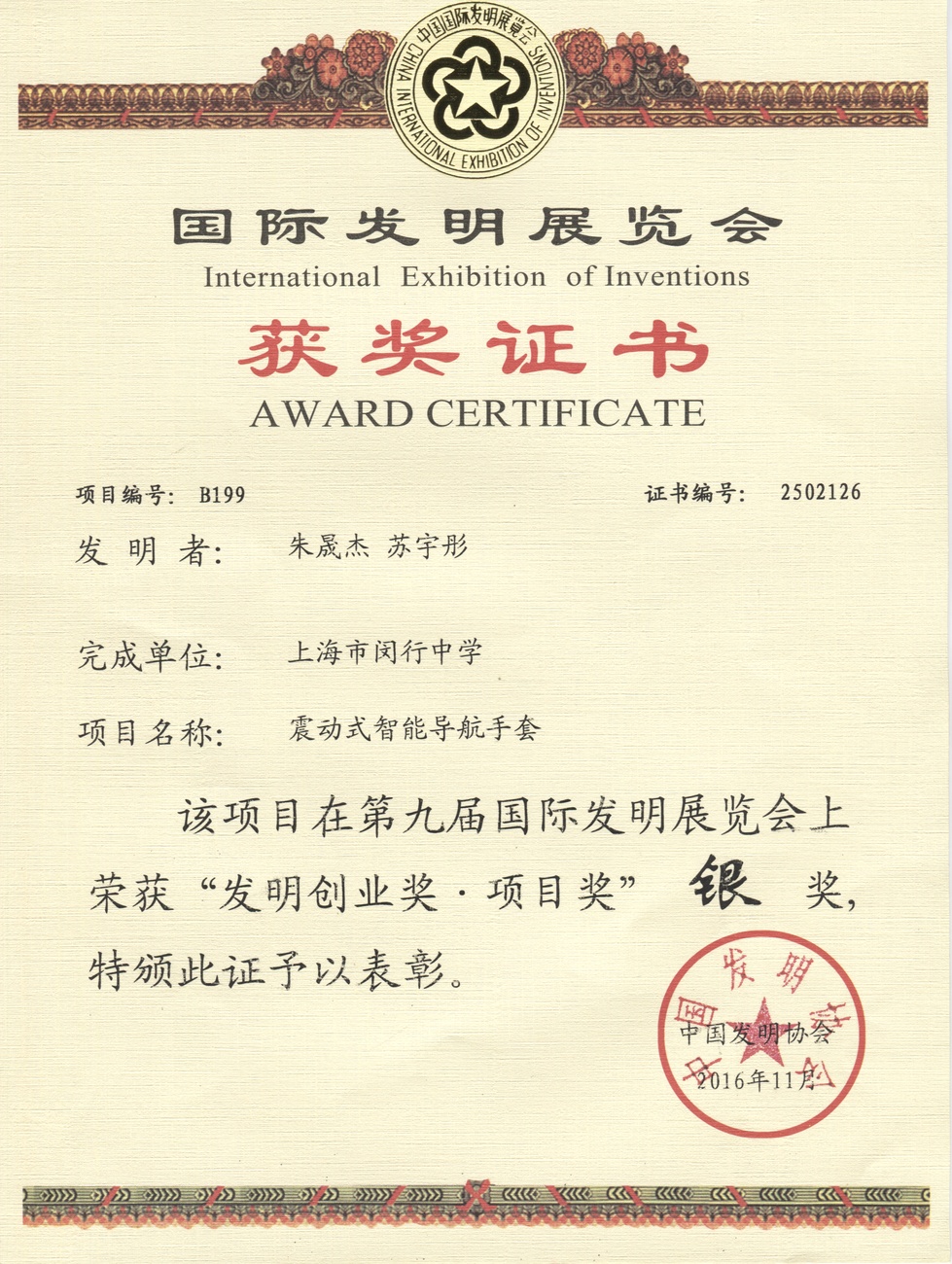 | 震动式智能导航手套 | 朱晟杰, 苏宇彤 | 银奖 | 2016年 |