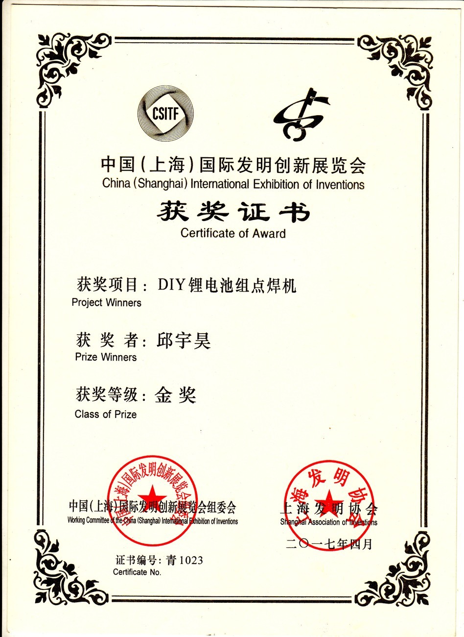 | DIY锂电池组点焊机 | 邱宇昊 | 金奖 | 2017年 |