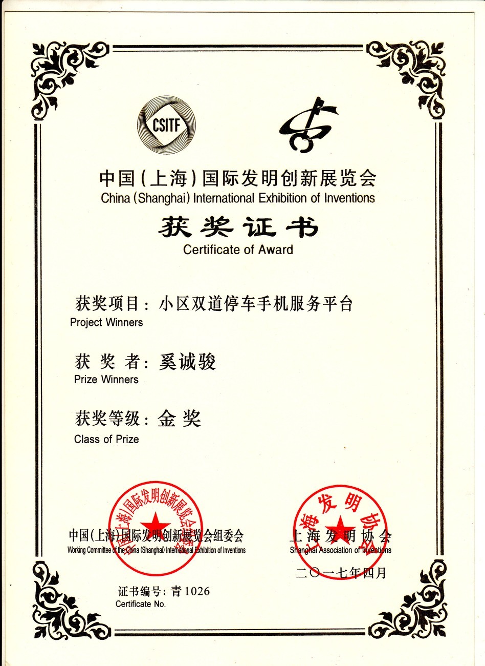 | 小区双道停车手机服务平台 | 奚诚骏 | 金奖 | 2017年 |