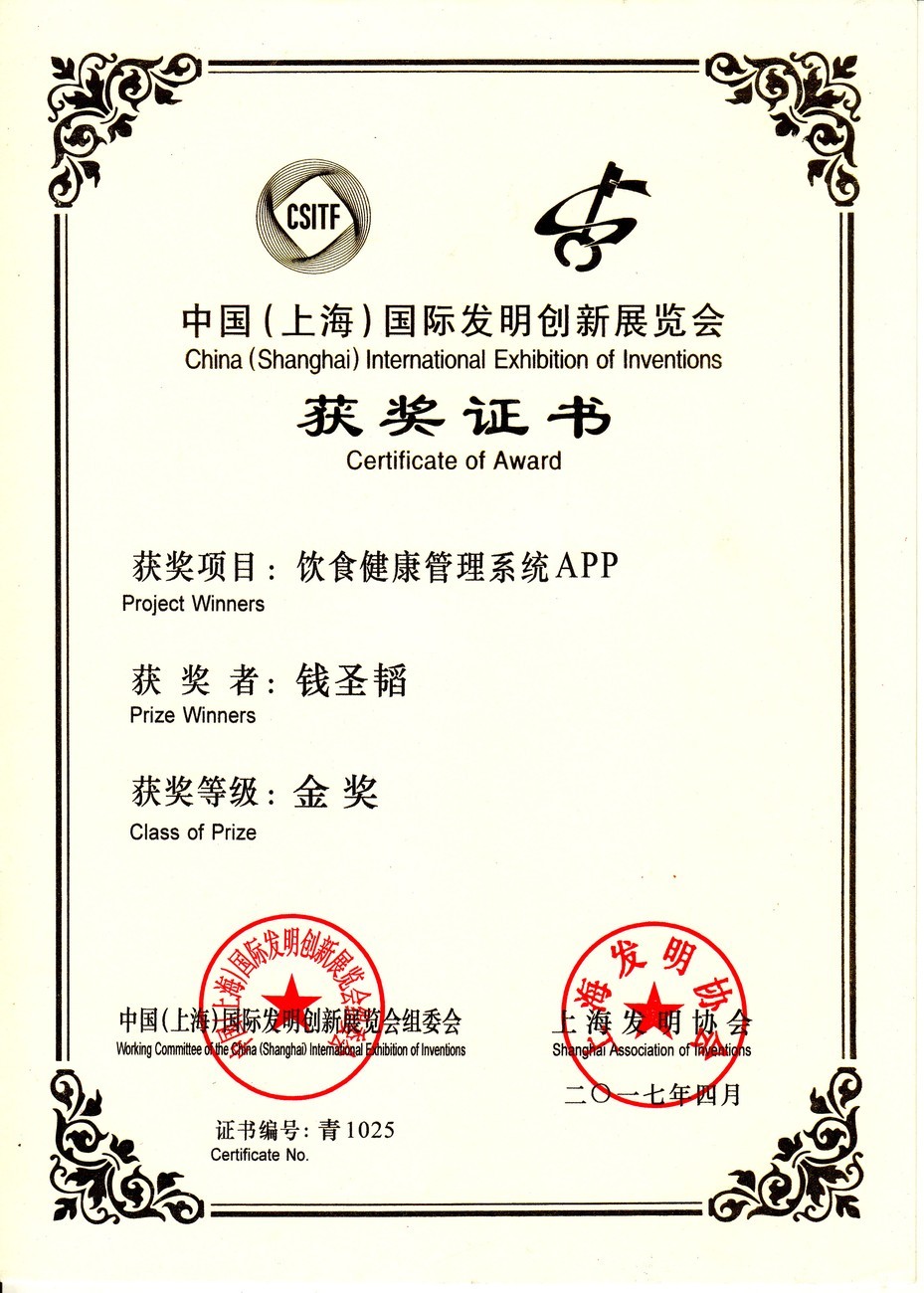 | 饮食健康管理系统APP | 钱圣韬 | 金奖 | 2017年 |