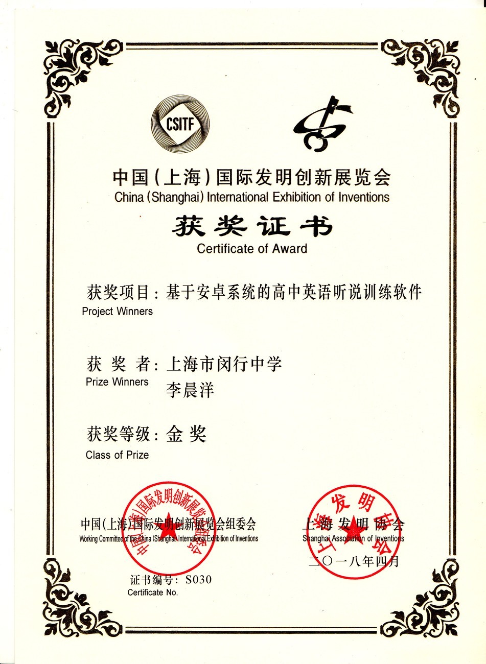| 基于安卓手机系统的高中英语听说训练软件 | 李晨洋 | 金奖 | 2018年 |