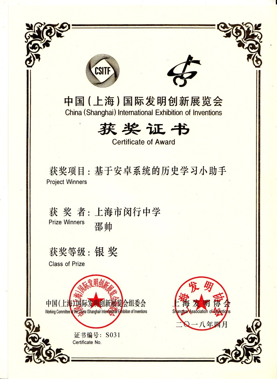 | 基于安卓系统的历史学习小助手 | 邵帅 | 银奖 | 2018年 |