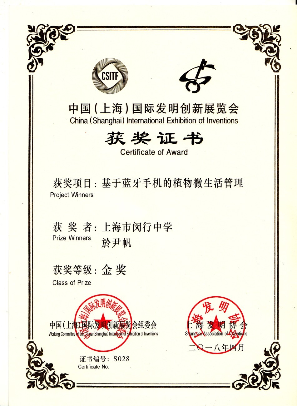 | 基于蓝牙手机的植物微生物生活管理 | 於尹帆 | 金奖 | 2018年 |