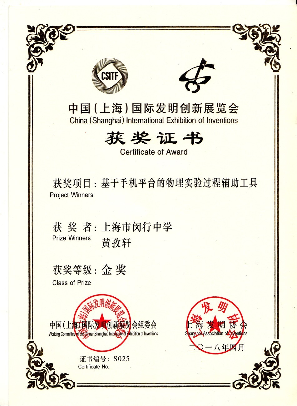 | 基于手机平台的物理实验过程辅助工具 | 黄孜轩 | 金奖 | 2018年 |