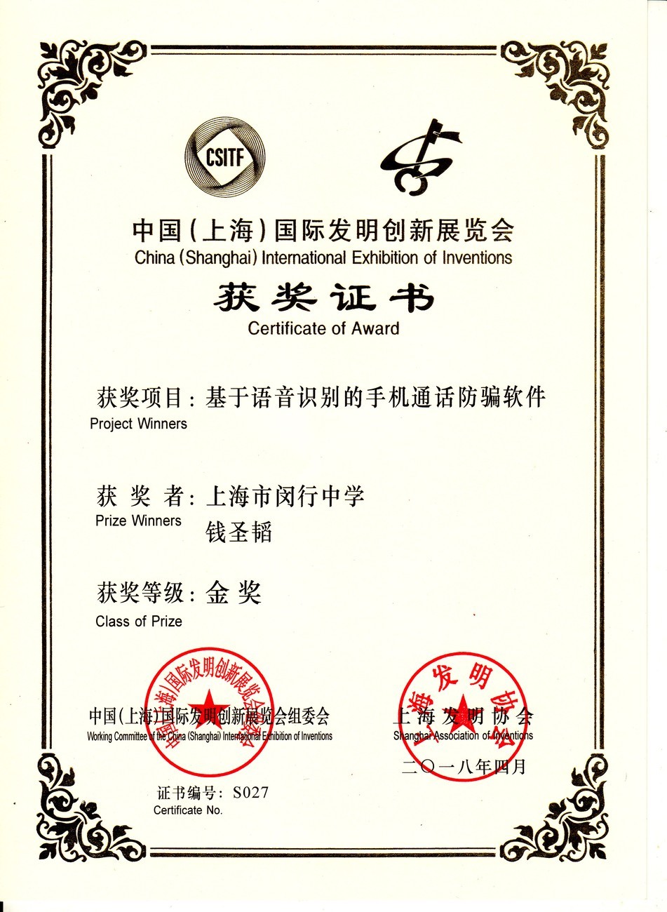 | 基于语音识别的手机通话防骗软件 | 钱圣韬 | 金奖 | 2018年 |