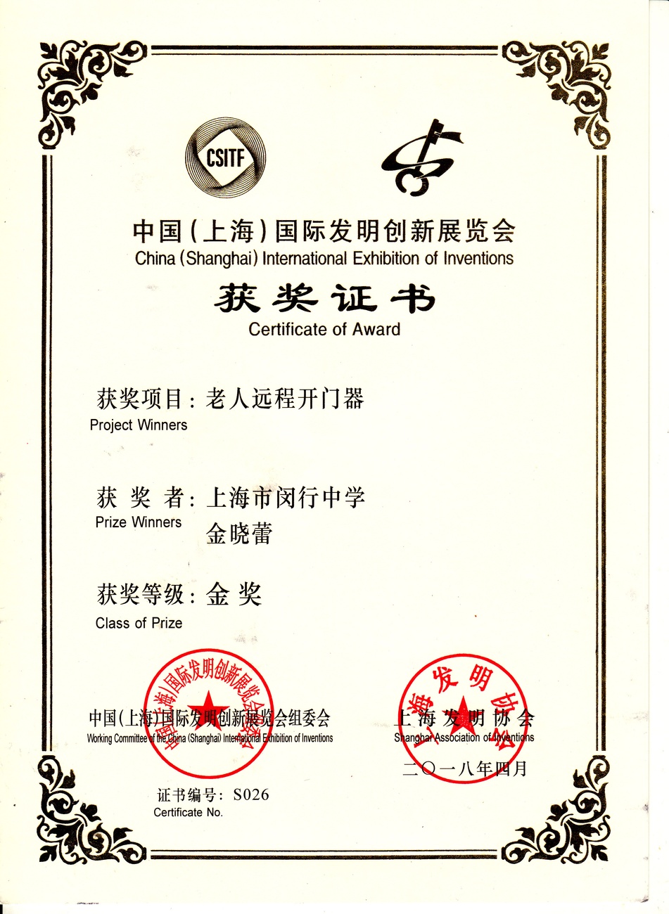 | 老人远程开门器 | 金晓蕾 | 金奖 | 2018年 |