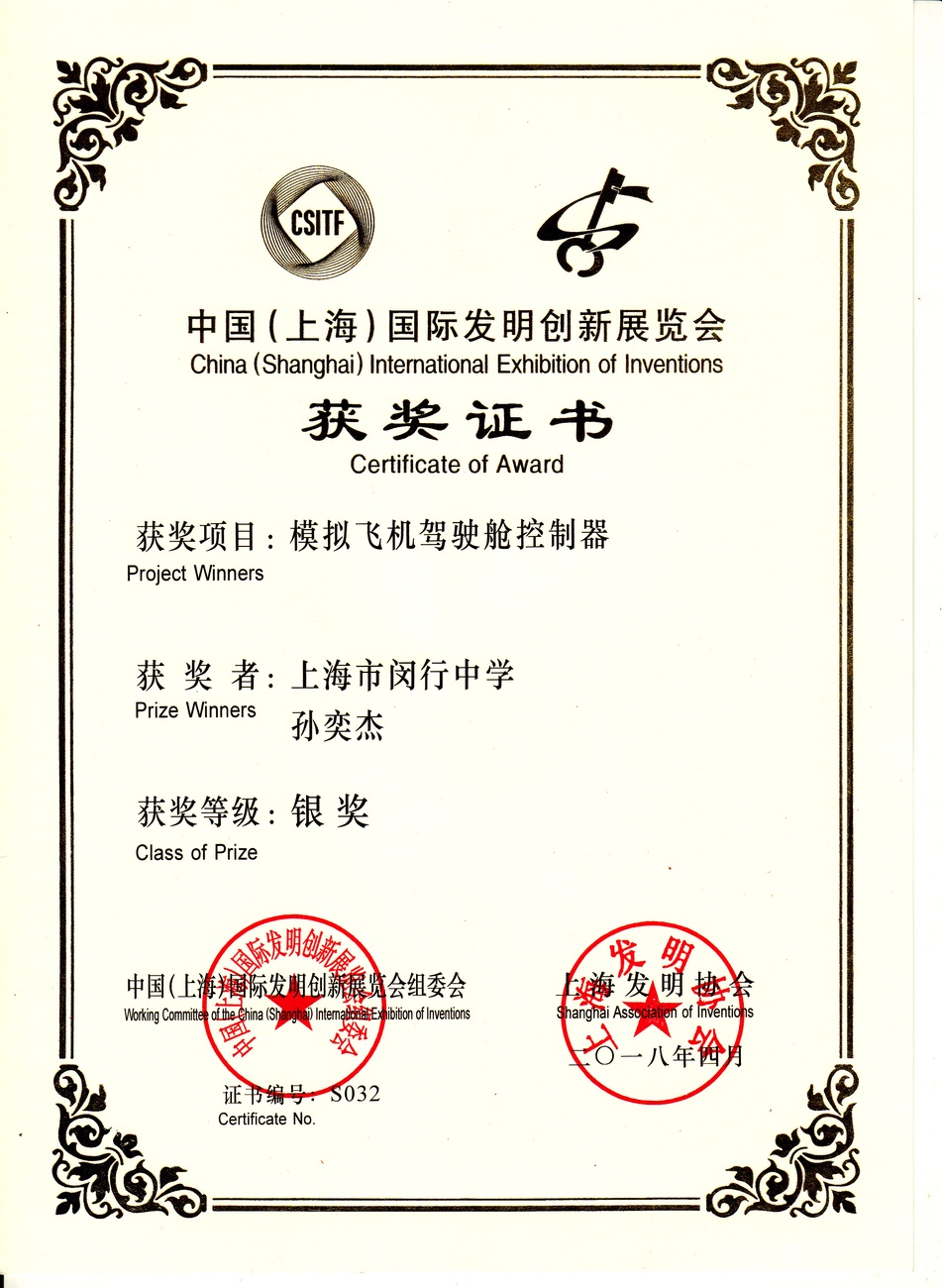 | 模拟飞机驾驶舱控制器 | 孙奕杰 | 银奖 | 2018年 |