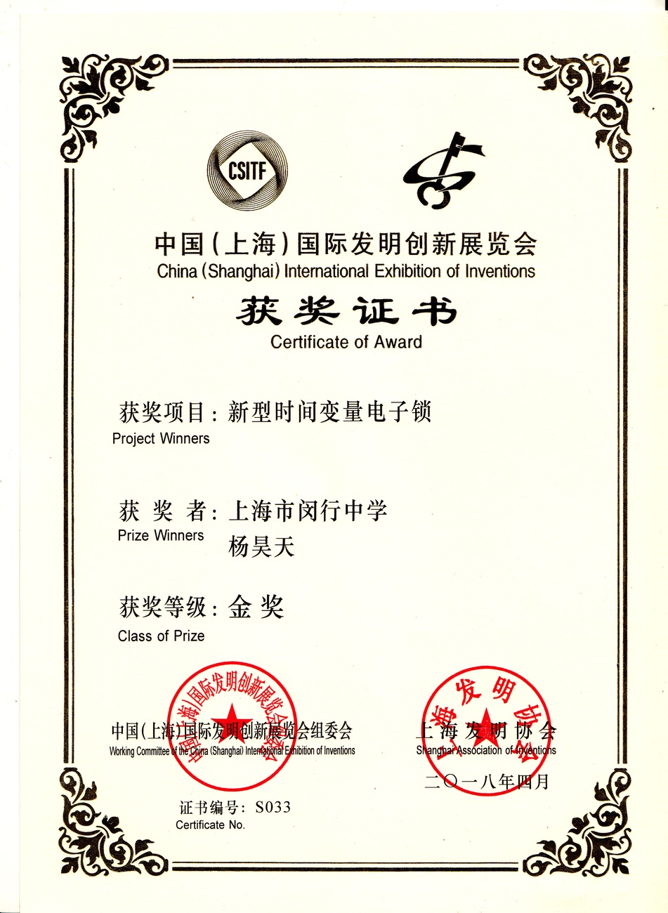 | 新型时间变量电子锁 | 杨昊天 | 金奖 | 2018年 |