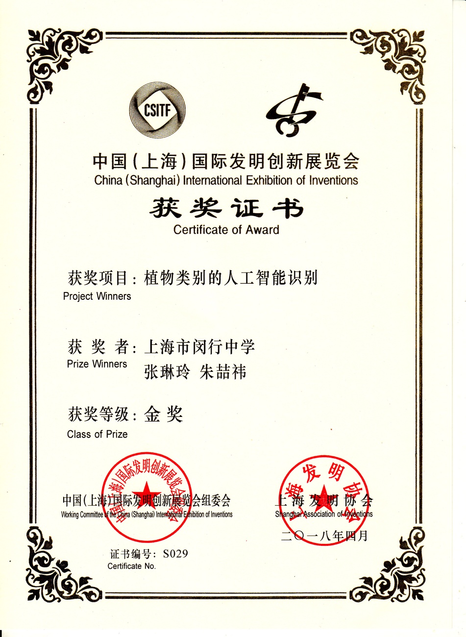 | 植物类别的人工智能识别 | 张琳玲,朱喆袆 | 金奖 | 2018年 |