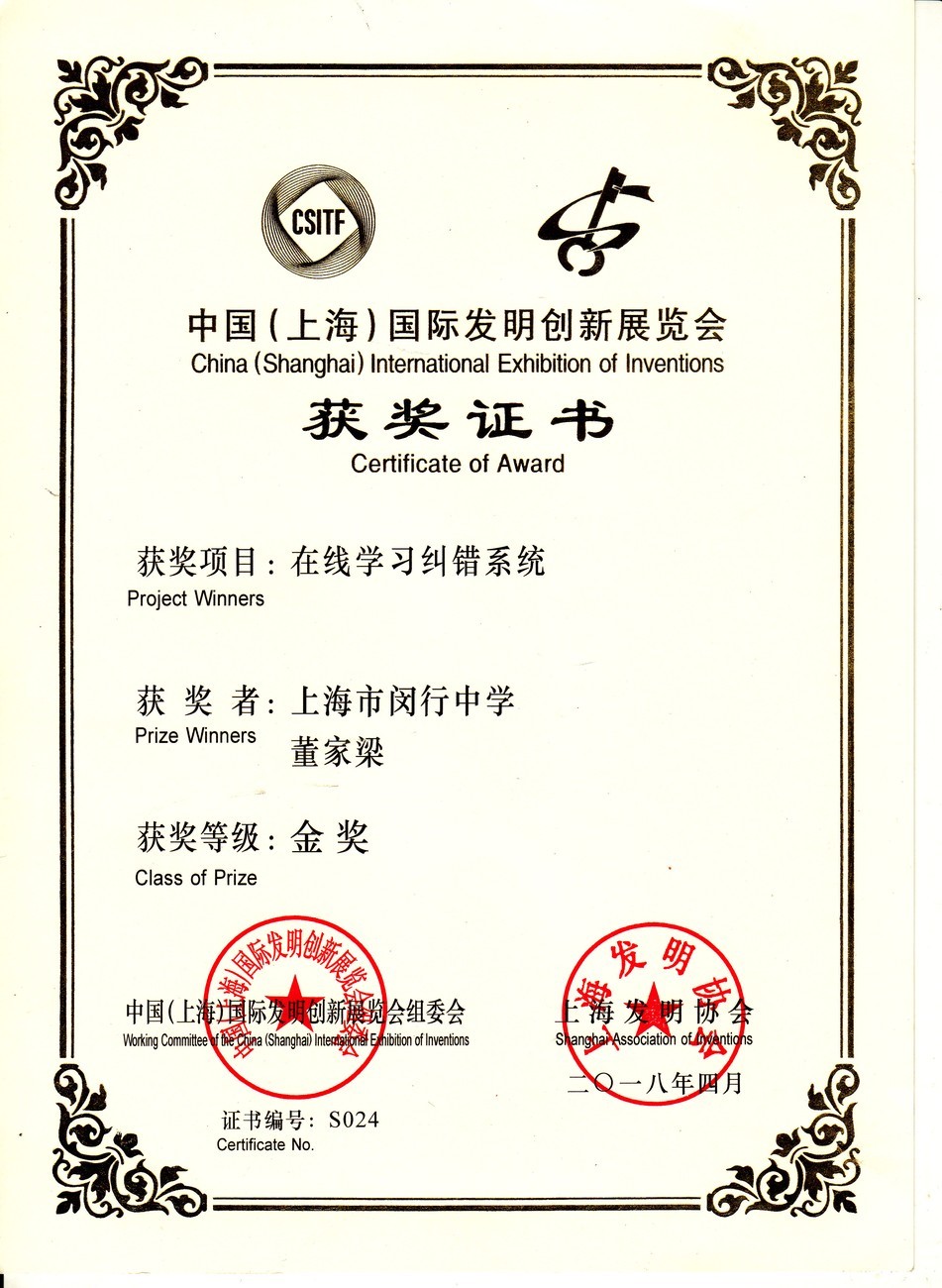 | 在线学习纠错系统 | 董家梁 | 金奖 | 2018年 |