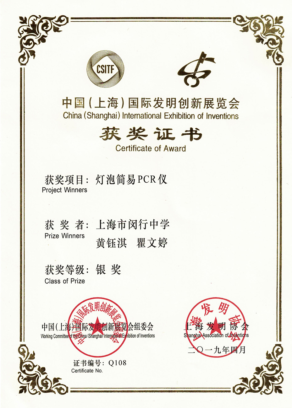 | 灯泡简易PCR仪 | 黄钰淇,瞿文婷 | 银奖 | 2019年 |