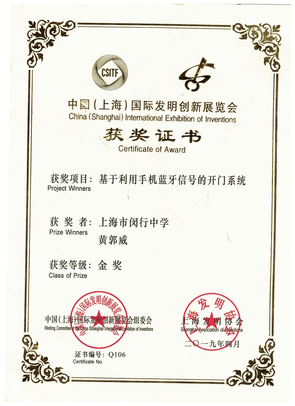 | 基于利用手机蓝牙信号的开门系统 | 黄郭威 | 金奖 | 2019年 |