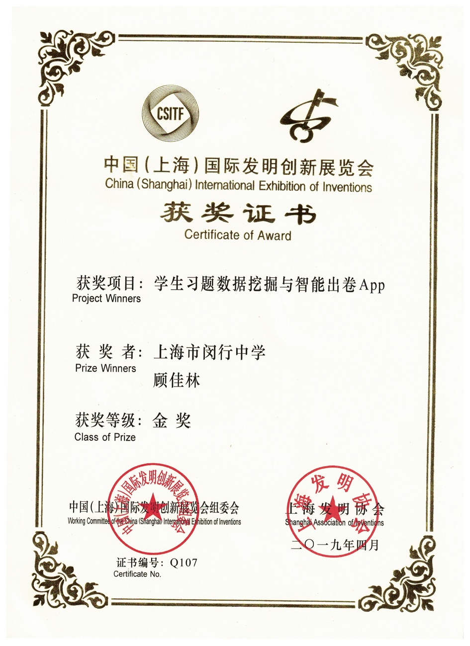 | 学生习题数据挖掘与智能出卷App | 顾佳林 | 金奖 | 2019年 |