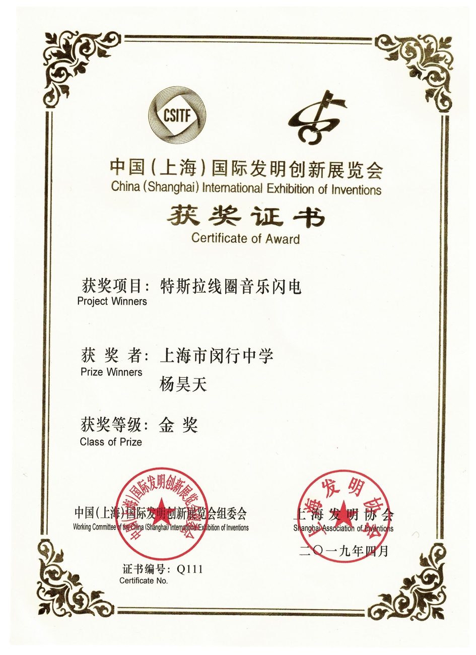 | 特斯拉线圈音乐闪电 | 杨昊天 | 金奖 | 2019年 |