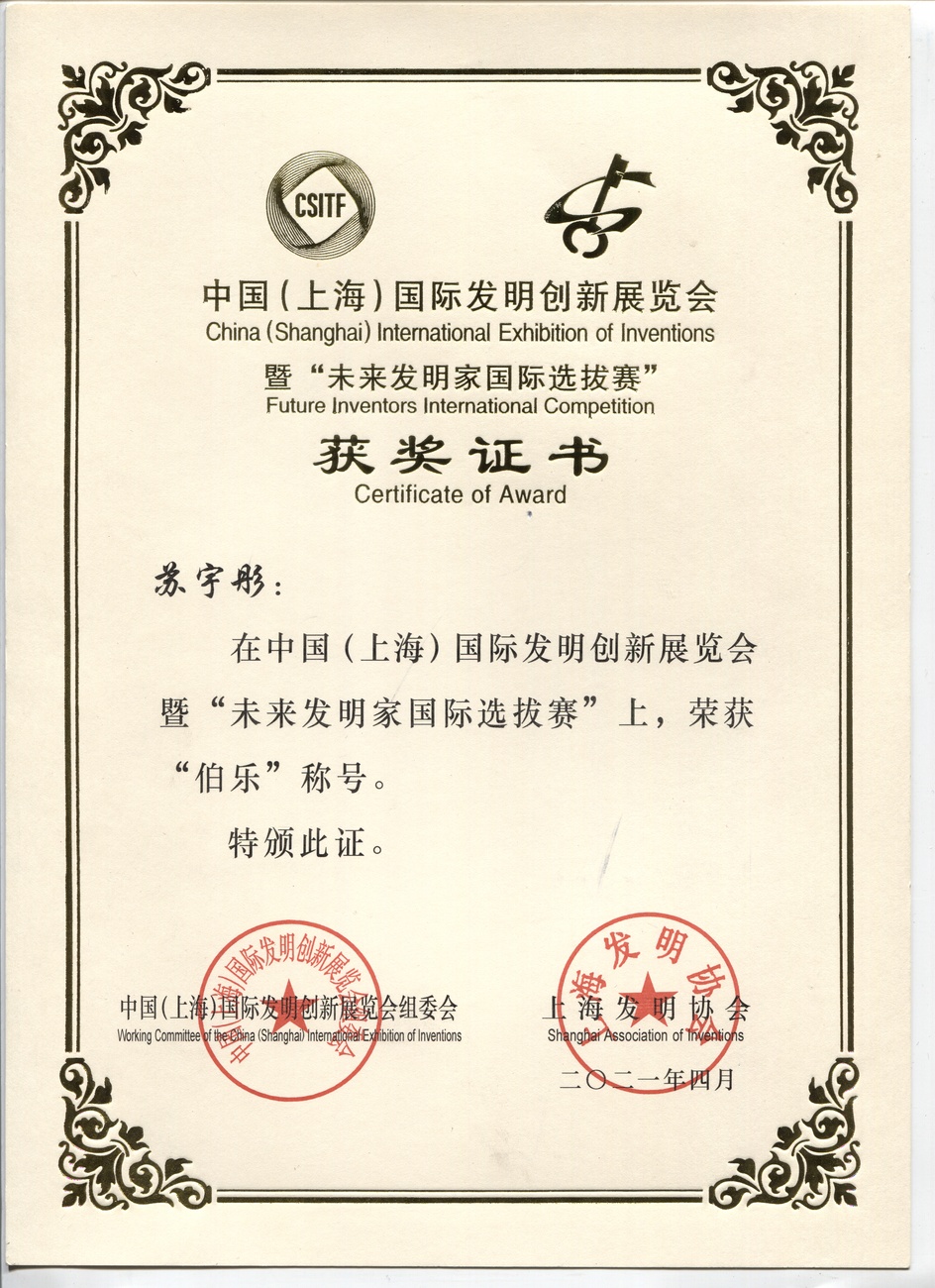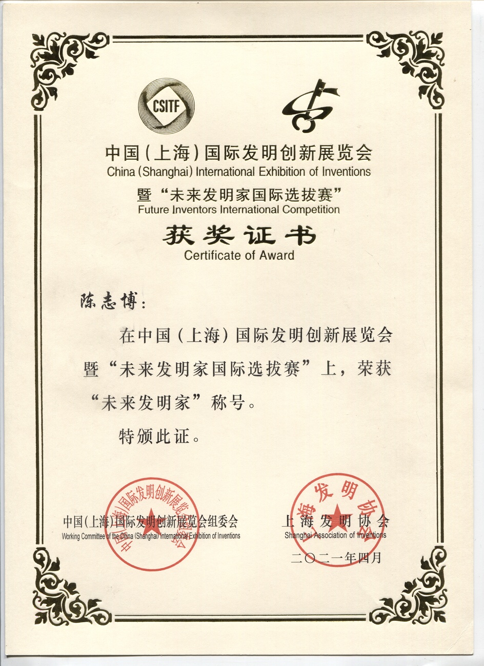 | "未来发明家"称号 | 陈志博 | 特别奖 | 2021年 |