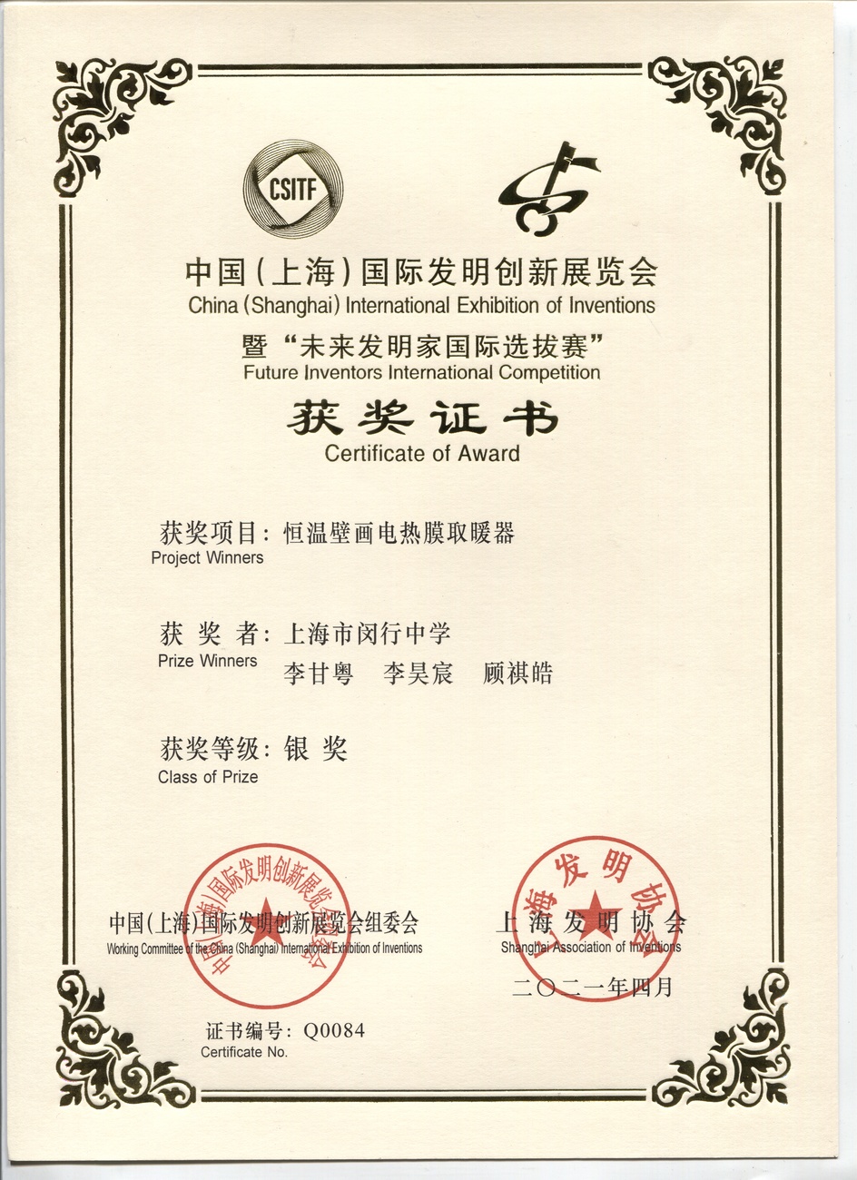 | 恒温壁画电热膜取暖器 | 李甘粤,李昊宸,顾祺皓 | 银奖 | 2021年 |