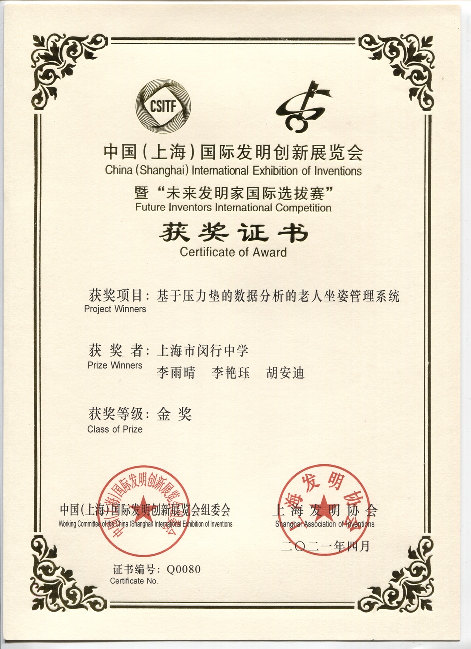 | 基于压力垫的数据分析的老人坐姿管理系统 | 李雨晴,李艳珏,胡安迪 | 金奖 | 2021年 |