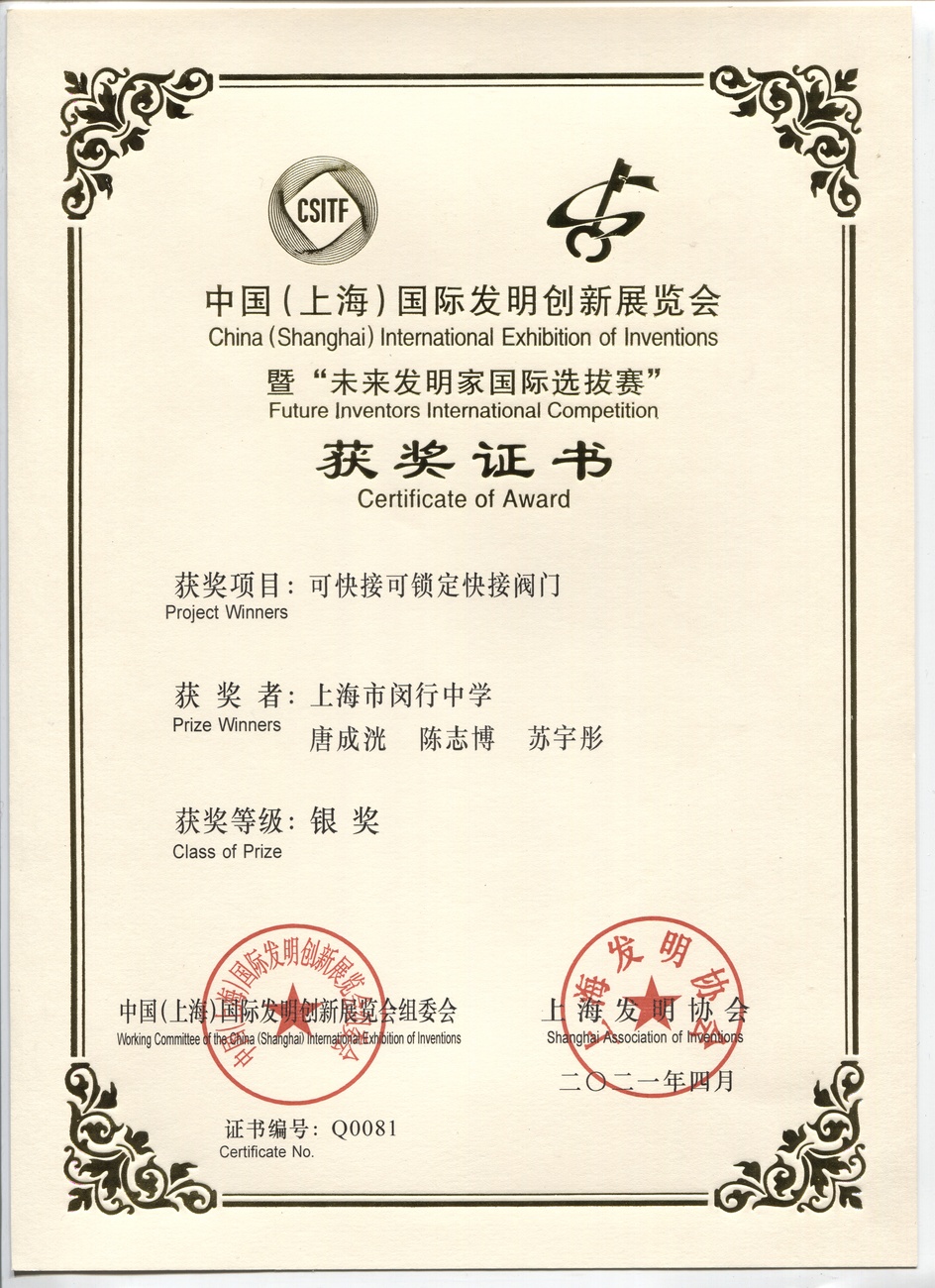 | 可快速可锁定快速阀门 | 唐成洸, 陈志博, 苏字彤 | 银奖 | 2021年 |