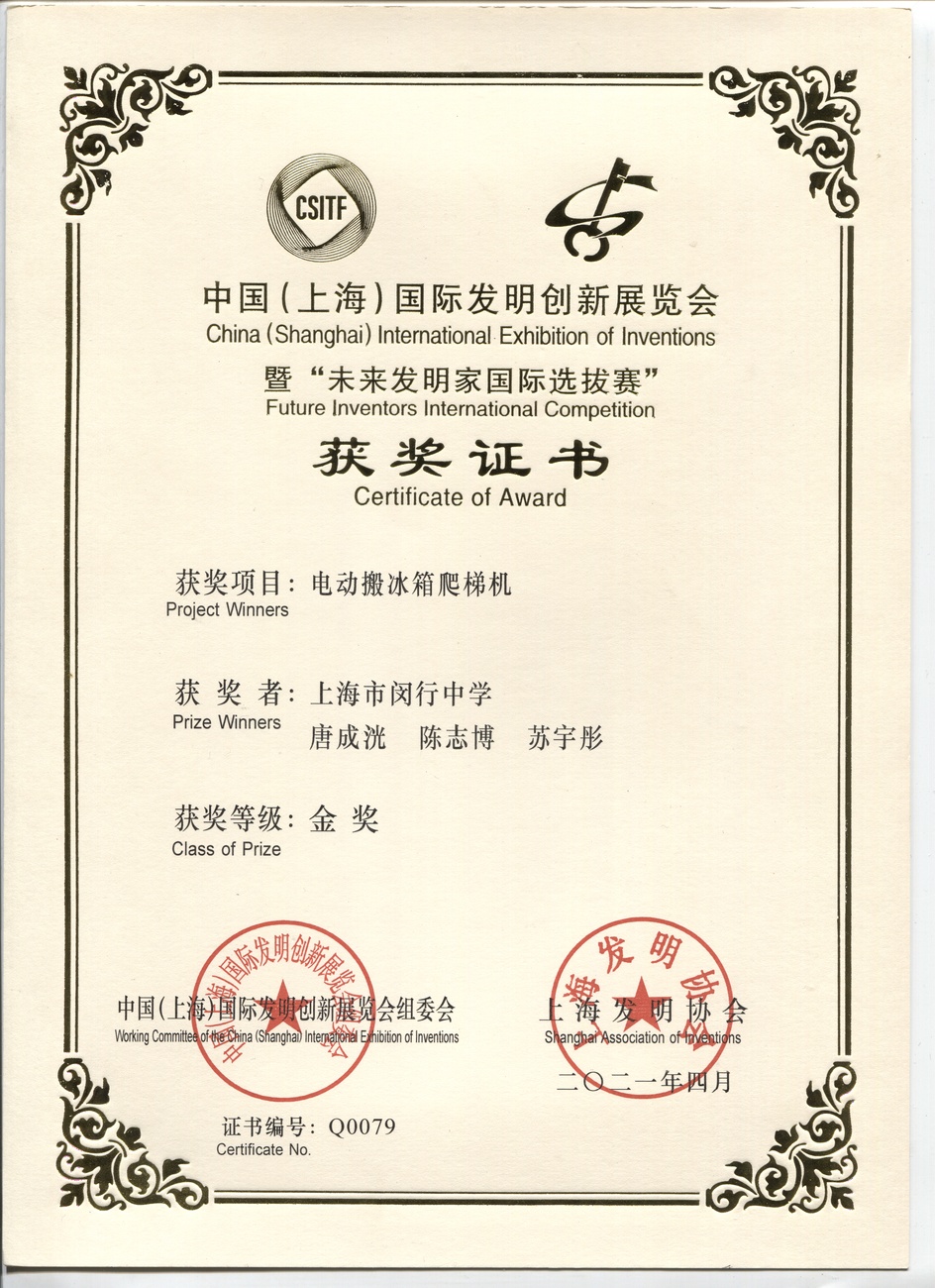 | 电动搬冰箱爬梯机 | 唐成洸, 陈志博, 苏字彤 | 金奖 | 2021年 |