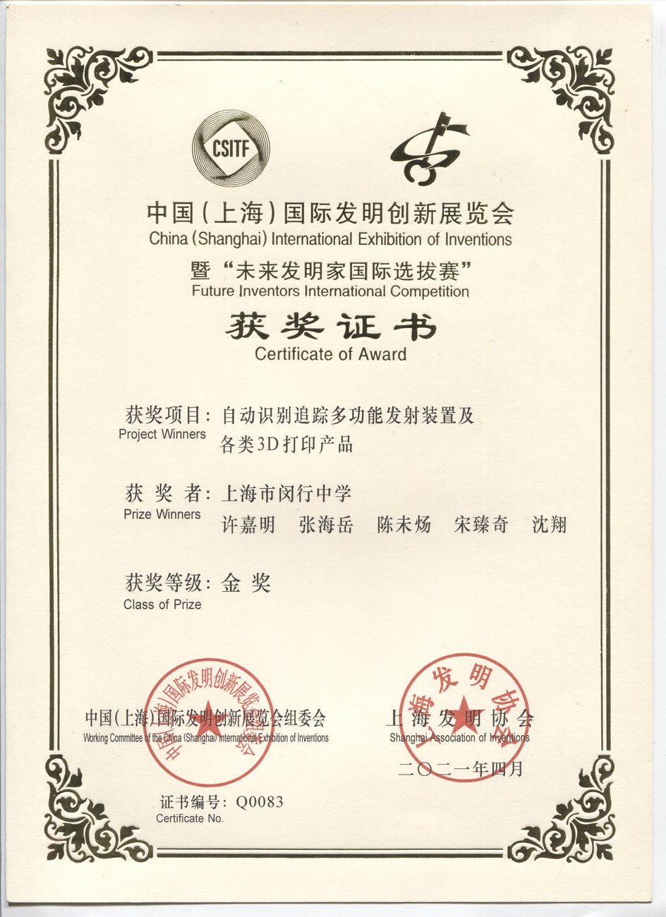 | 自动识别追踪多功能发射装置及各类3D打印产品 | 许嘉明, 张海岳, 陈未扬, 宋臻奇, 沈翔 | 金奖 | 2021年 |