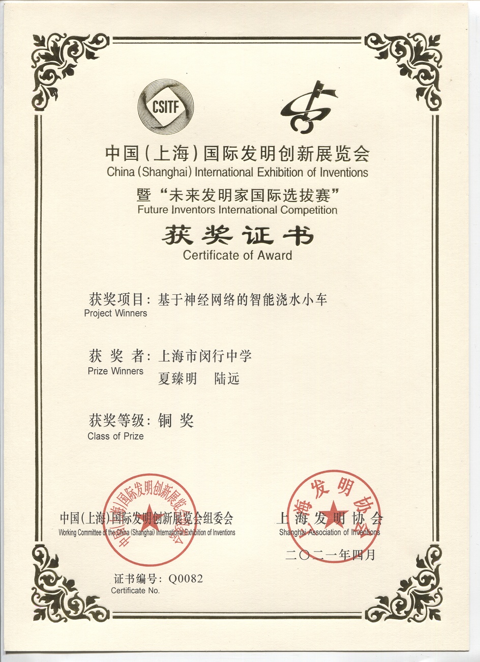 | 基于神经网络的智能洗水小车 | 夏臻明, 陆远 | 铜奖 | 2021年 |