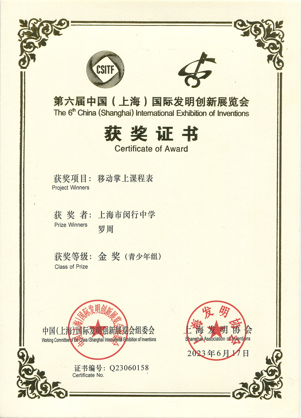 | 移动掌上课程表 | 罗周 | 金奖 | 2023年 |
