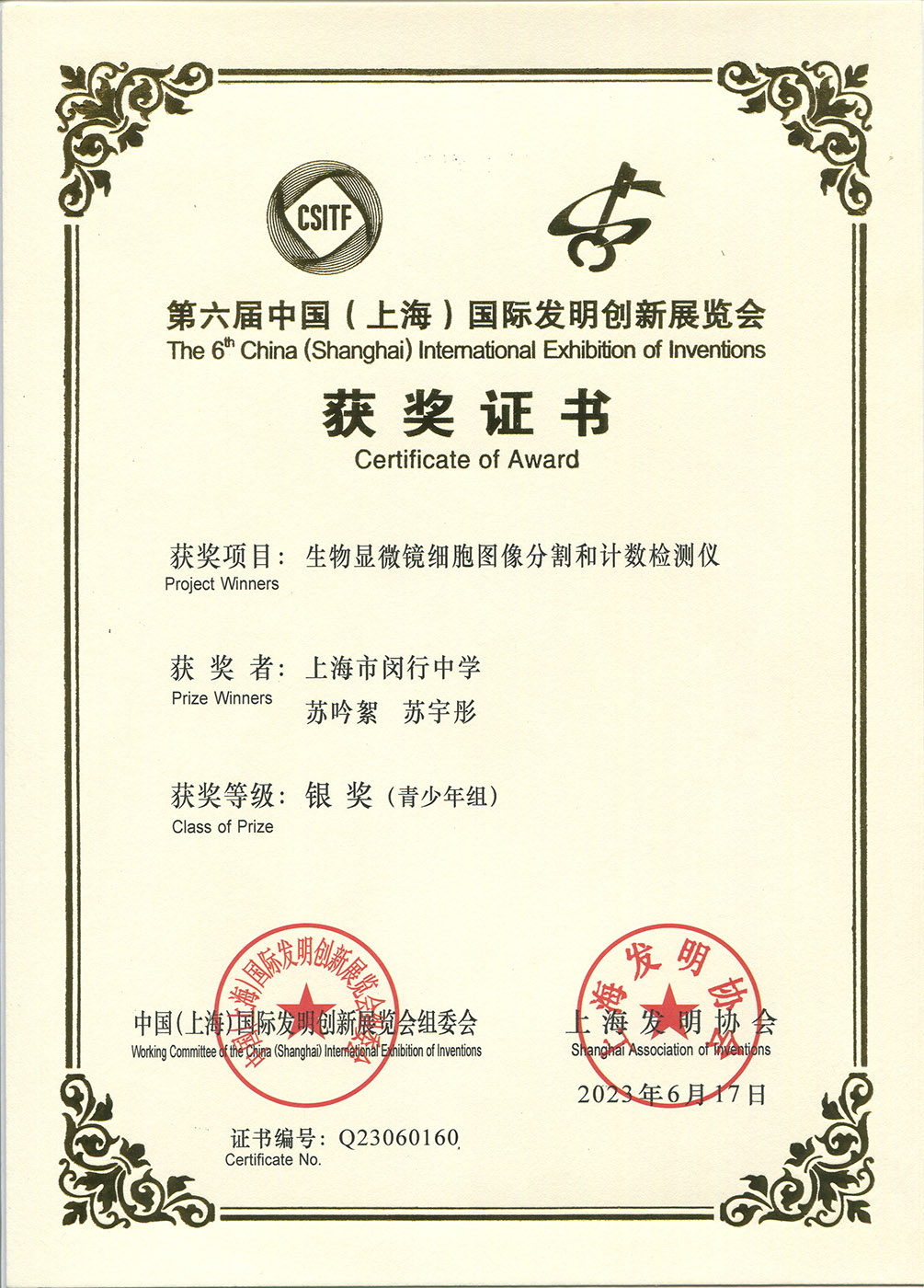 | 生物显微镜细胞图像分割和计数检测仪 | 苏吟絮,苏宇彤 | 银奖 | 2023年 |