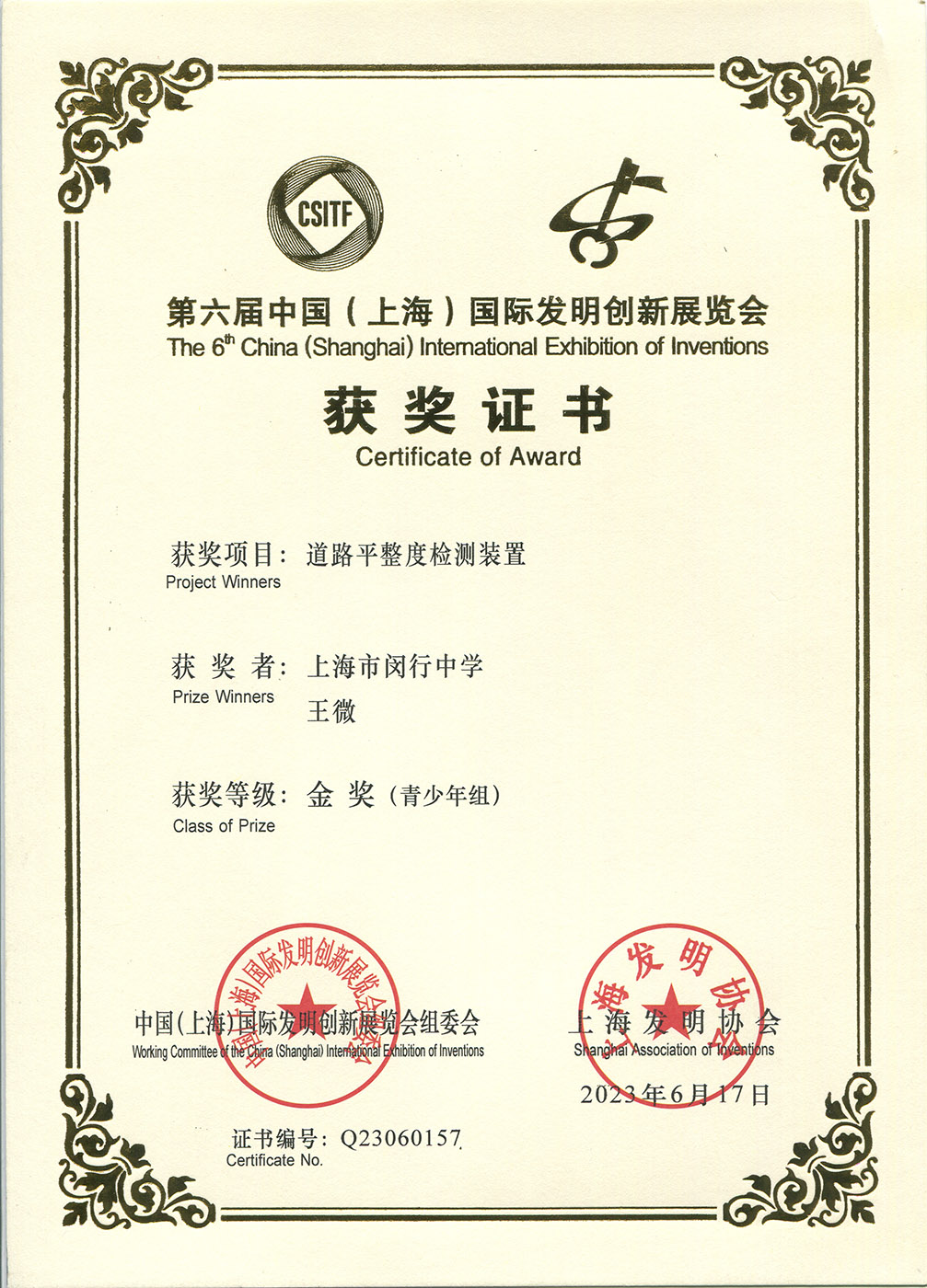 | 道路平整度检测装置 | 王微 | 金奖 | 2023年 |