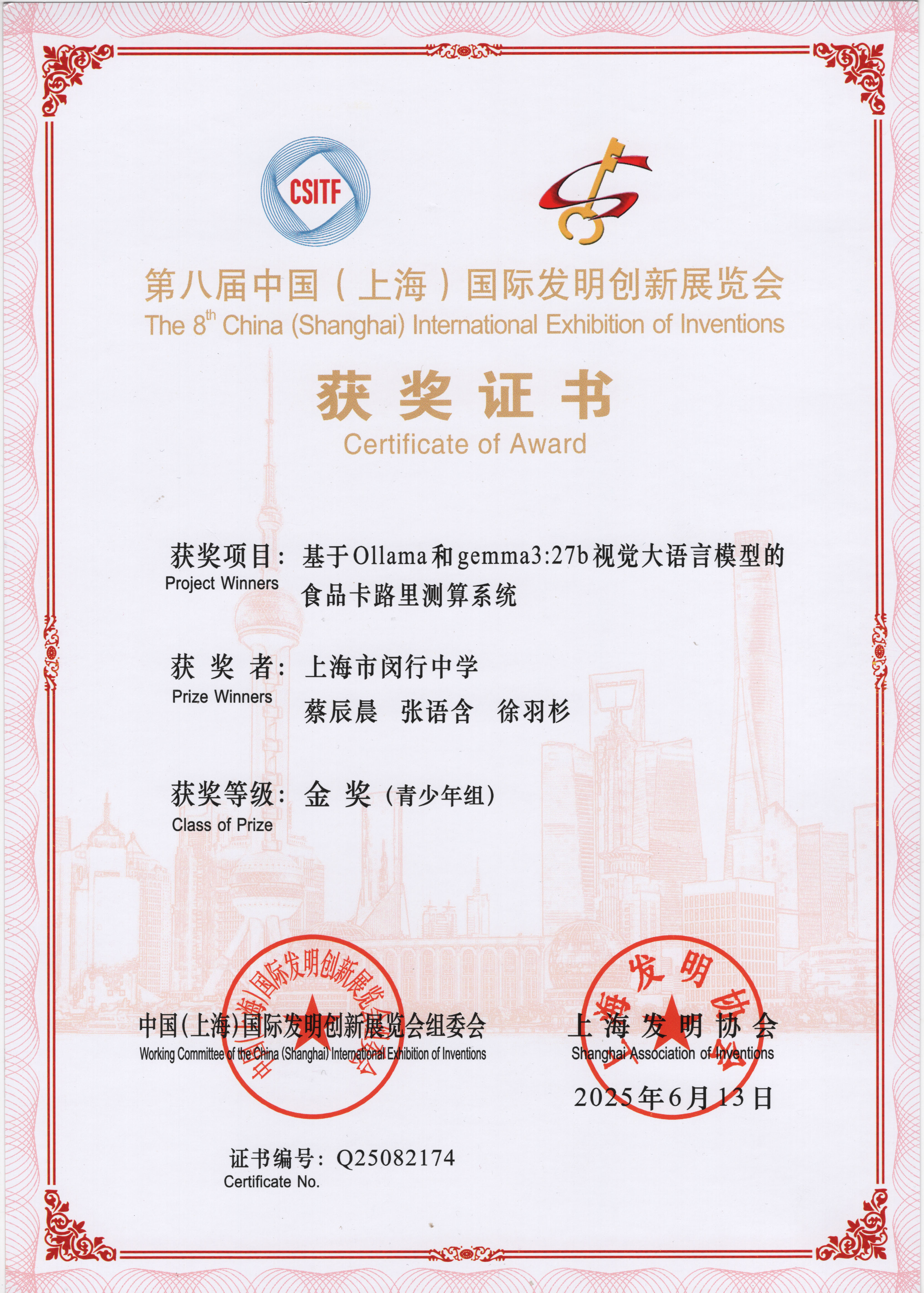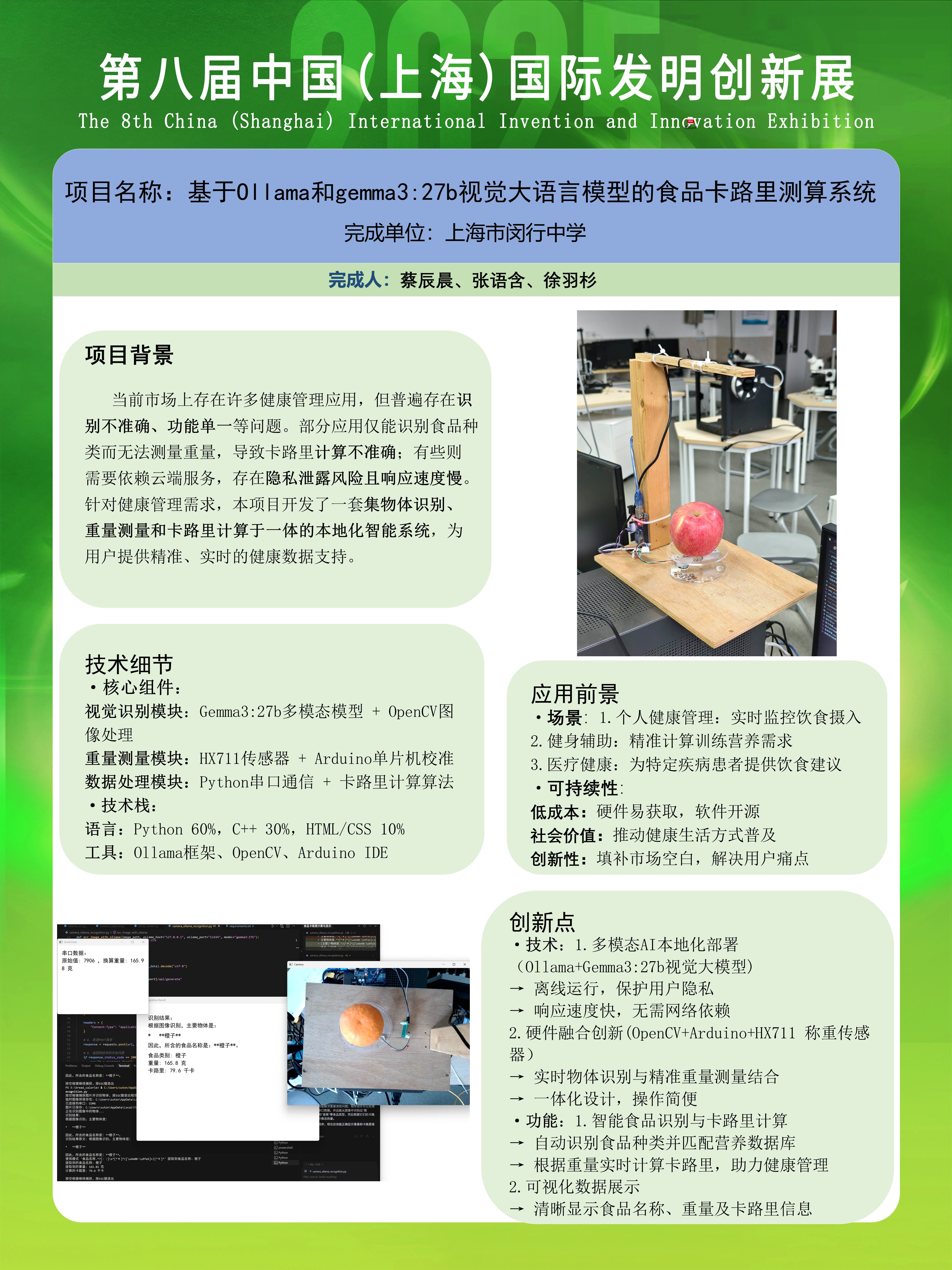 | 基于Ollama和gemma3:27b视觉大语言模型的食品卡路里测算系统 | 蔡辰晨,张语含,徐羽杉 | 金奖 | 2025年 |