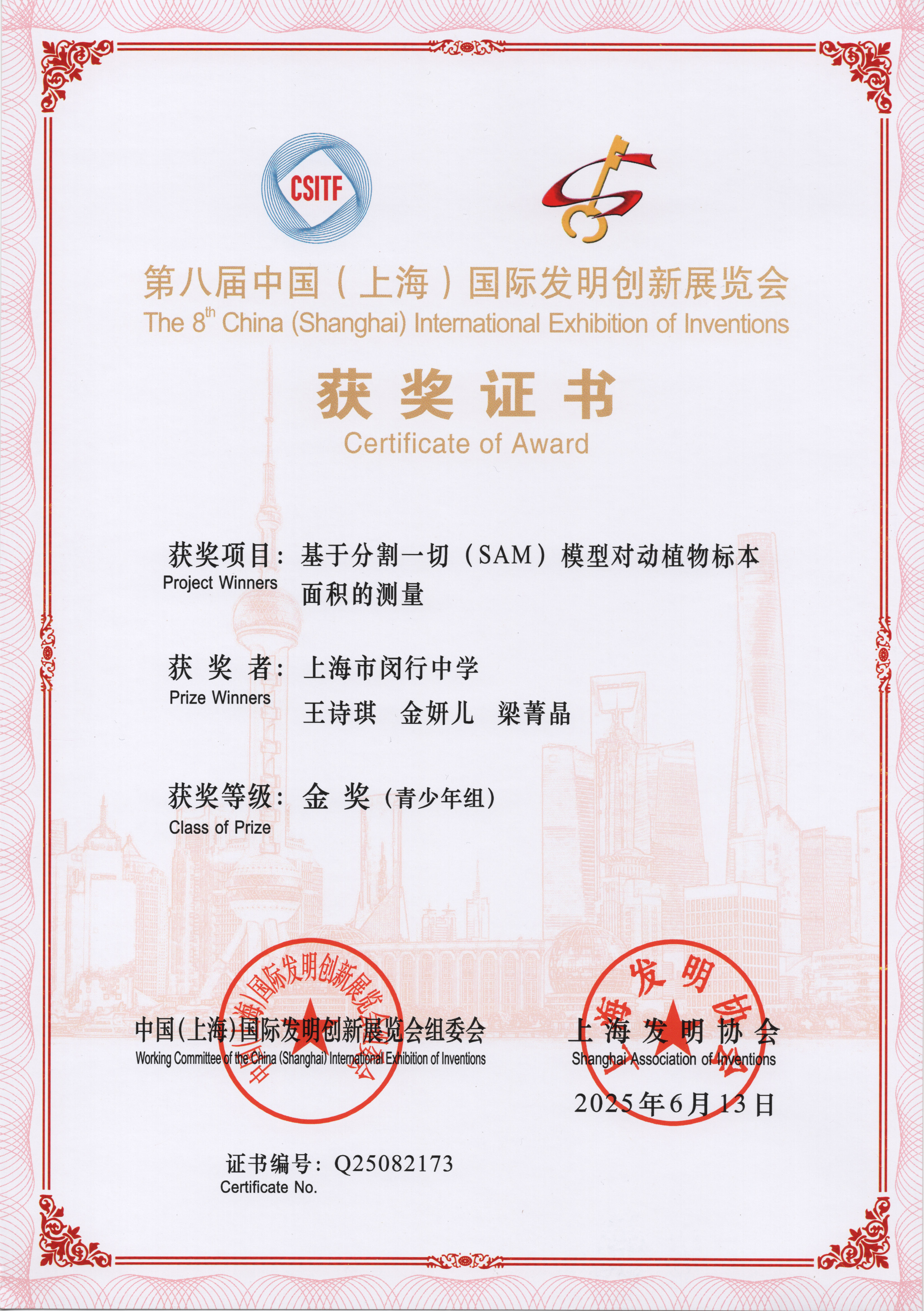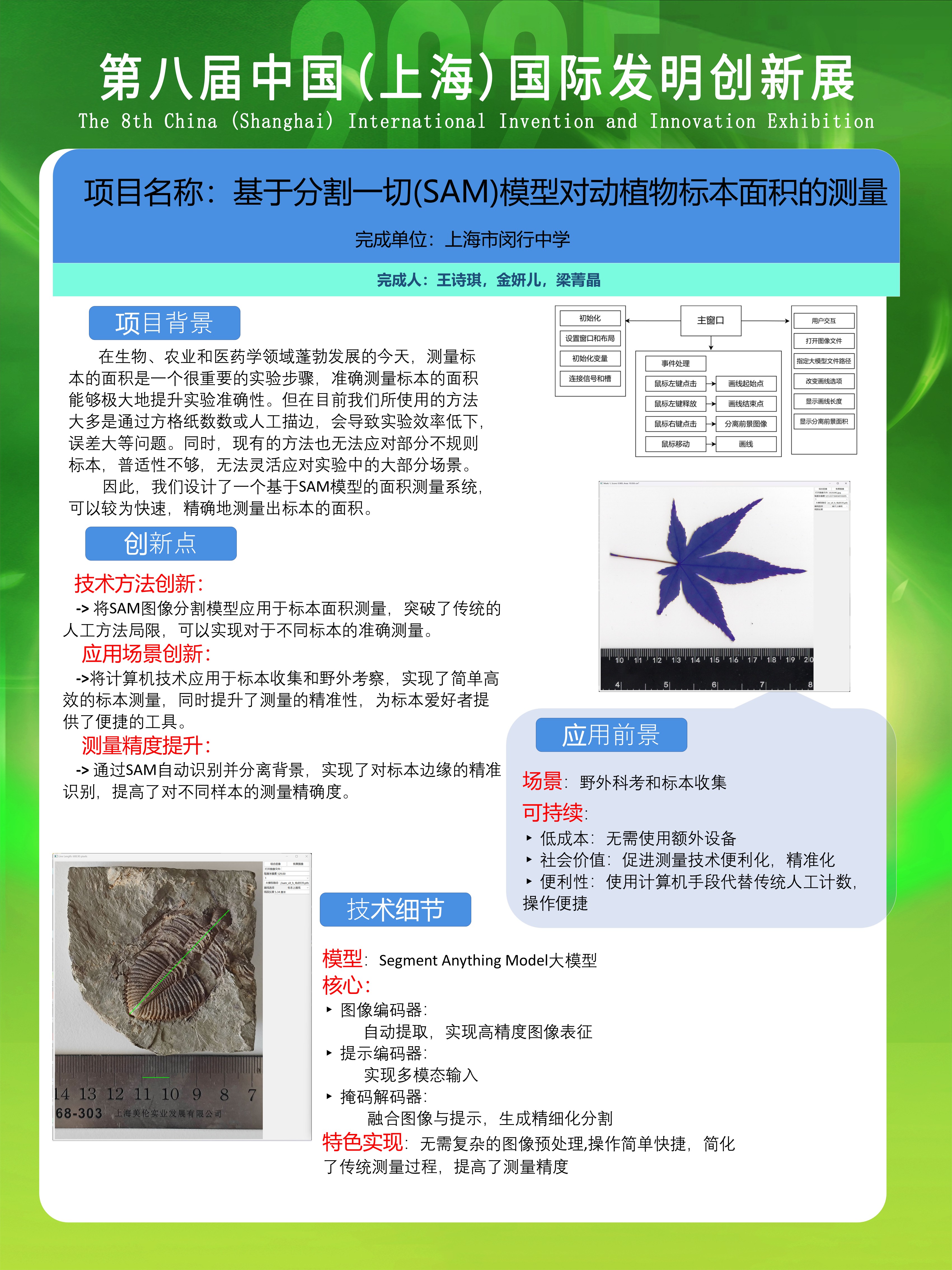 | 基于分割一切(SAM)模型对动植物标本面积的测量 | 王诗琪,金妍儿,梁菁晶 | 金奖 | 2025年 |