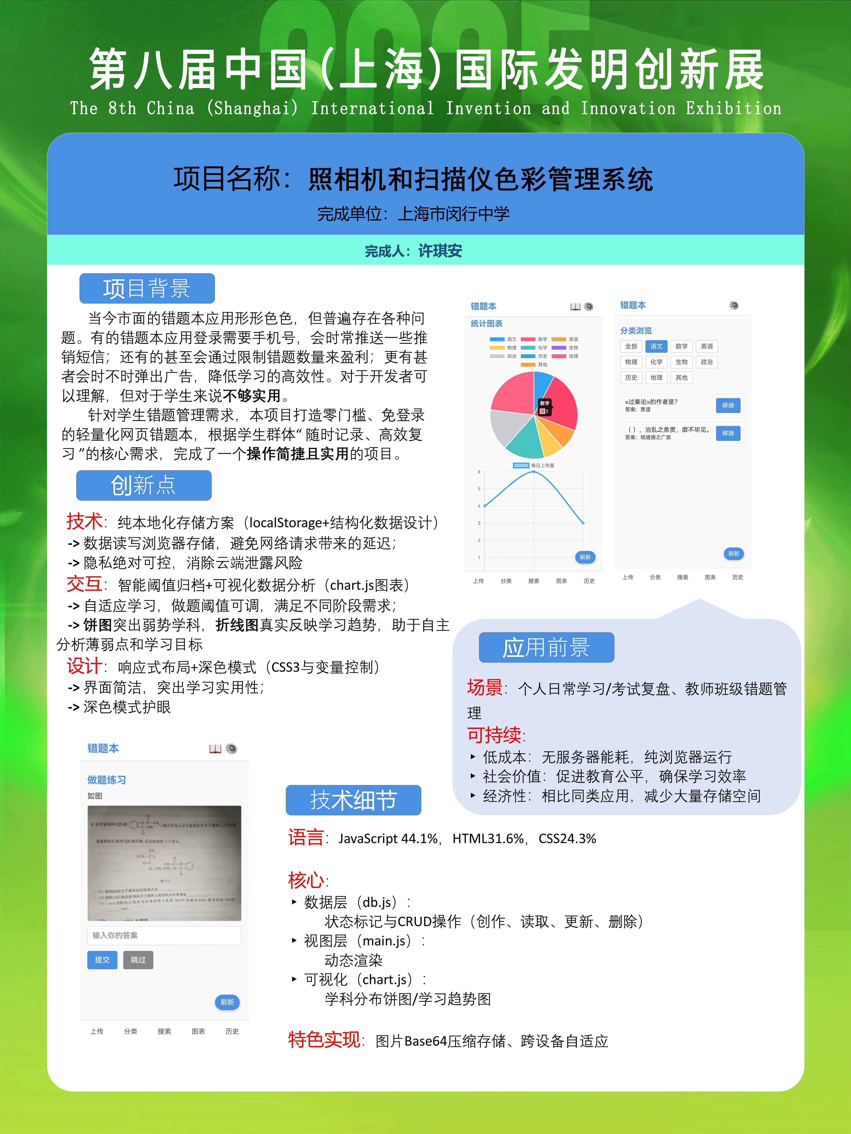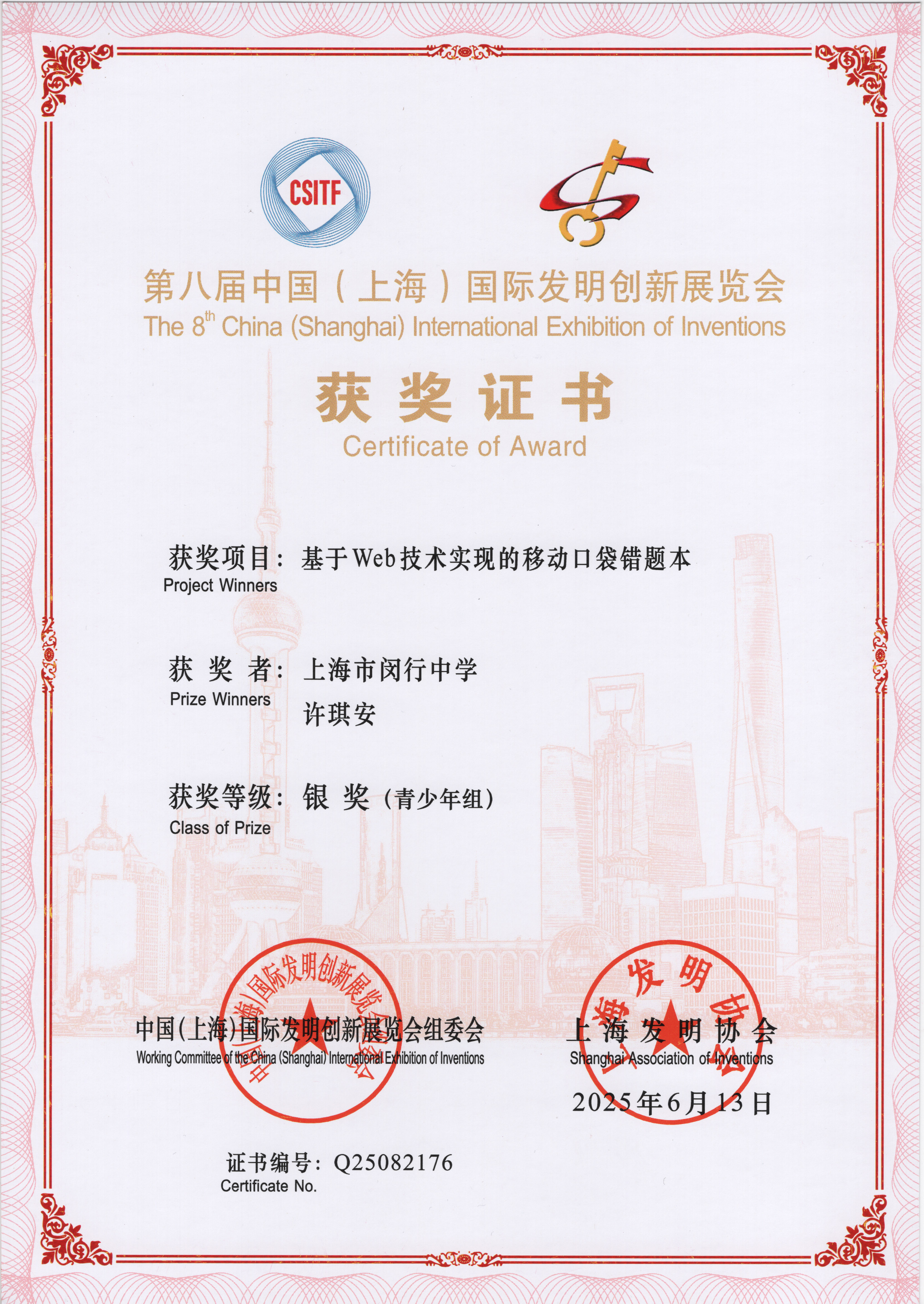 | 基于Web技术实现的移动口袋错题本 | 许琪安 | 银奖 | 2025年 |